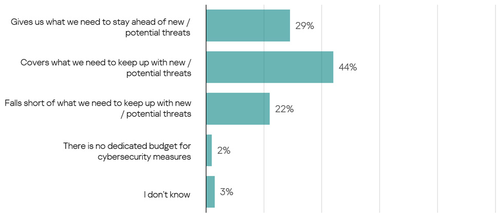 When asked about the budget for cybersecurity measures, 74% of respondents from the META region said they are equipped to keep up with or even stay ahead of new threats. However, 24% of companies are not doing so well – 22% report that they don’t have sufficient funds to protect the company’s infrastructure properly. At the same time, there are still companies without cost allocations for cybersecurity at all – 2% claimed they don’t have a dedicated budget for cyber protection needs.