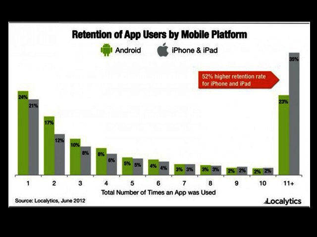 The average Android app also suffers from 24% one-time usage rate compared to a 21% one-time usage rate for iPhone and iPad.