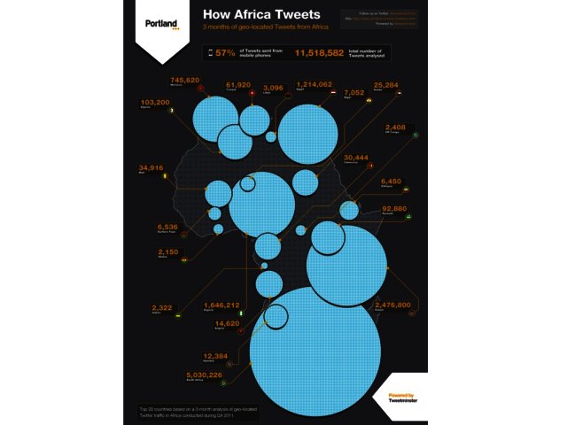 Portland along with media platform Tweetminster have analysed more than 11.5 million geo-located tweets originating on the continent during the last three months of 2011. This pan-African analysis of Twitter traffic was complemented by a survey of 500 of Africa’s most active tweeters.