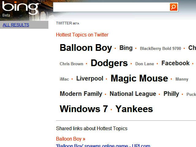 In an announcement at the Web 2.0 Summit in San Francisco, Microsoft unveiled a live beta of its Twitter search results at Bing.com/twitter. The page features a tag cloud of hot topics on Twitter and a list of shared links on hot topics as a default landing page. From there users can search Twitter via a traditional search box. Search results for Twitter weren’t available, however, when we tried the service.