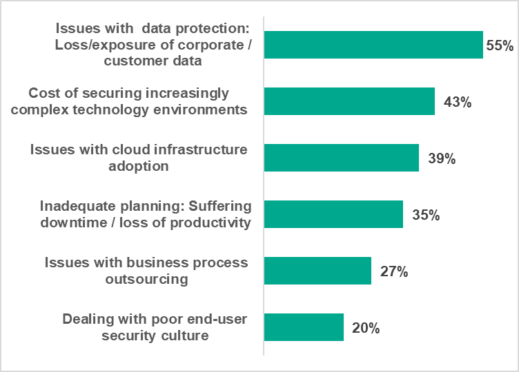 Kaspersky’s global research, conducted among IT decision-makers, shows a loss or exposure of corporate and customer information because of a data breach is a major headache for companies - 55% of respondents from organisations of all sizes in the META region named this issue the most challenging aspect related to IT security. Among other most common concerns there are cost of securing increasingly complex technology environments and issues with cloud infrastructure adoption with 43% and 39% share respectively.